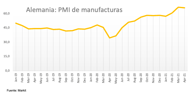 En el calendario doméstico, las ventas minoristas en Alemania se han expandido fuertemente 7.7% en términos mensuales durante marzo, mientras que el PMI final de manufacturas de abril ha sido apenas por debajo de la lectura preliminar en 66.2, igualmente dando evidencias de la mejora en la moral del sector.