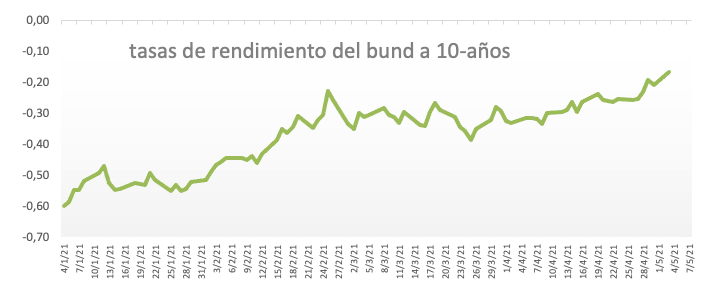 Mientras tanto, el mejor ánimo entre los operadores da renovado optimismo al universo de activos asociados al riesgo, sosteniendo la suba en el par y en las tasas de rendimiento del bono alemán de referencia a 10-años, que trepa a la zona de -0.16%, área visitada por última vez en marzo de 2020.