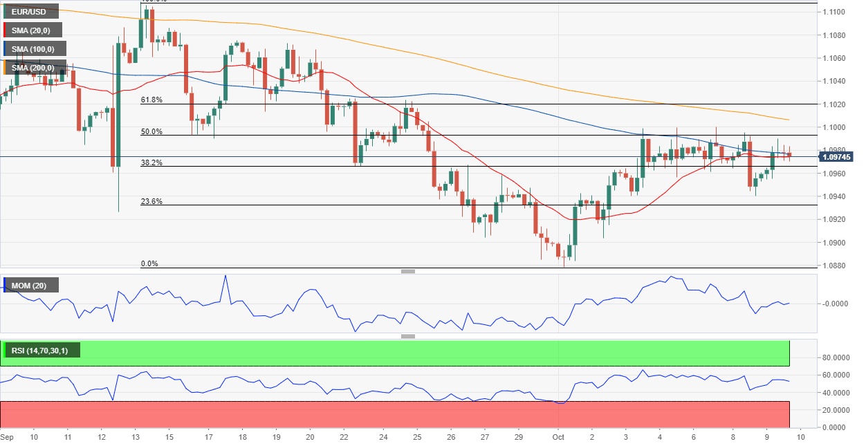 El par EUR/USD ha recortado las pérdidas del martes, pero carece de un impulso direccional claro, ya que ha estado alrededor de los niveles actuales durante más de una semana. A corto plazo, y de acuerdo con el gráfico de 4 horas, el riesgo está sesgado a la baja, ya que el par no ha podido recuperarse más allá de la media móvil simple de 20 y 100, ambos confinados a un rango ajustado de 10 pips y con modestas pendientes bajistas. Además, los indicadores técnicos se mueven alrededor de sus líneas medias, Momentum hacia el sur y el RSI plano, lo que refleja la falta de interés especulativo.