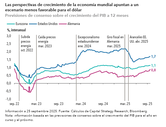 Ambas cosas están sucediendo ahora, lo que sugiere que el Dólar emprenderá un giro cíclico a la baja durante los próximos doce meses, principalmente frente al euro. La cuestión de si esto se prolongará o no después de 2026 depende de que los diferenciales del crecimiento continúen reduciéndose.