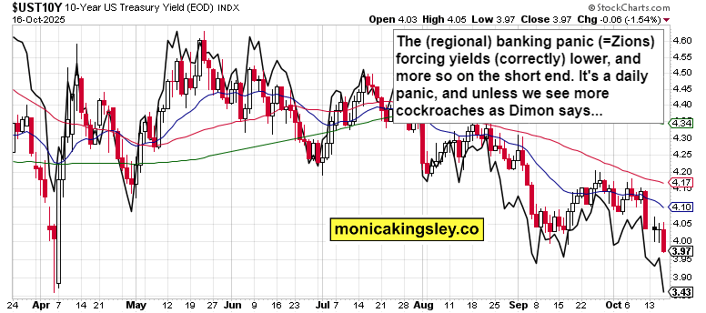 El S&P 500 revirtió a la baja poco después de la campana de apertura, y el movimiento bajista que resultó para todos los clientes fue de más de +100 puntos ES (y más de +500 puntos NDX) – el pánico bancario regional hizo su magia (Zions liderando, las palabras de Dimon sobre que usualmente hay más de una cucaracha presentes).