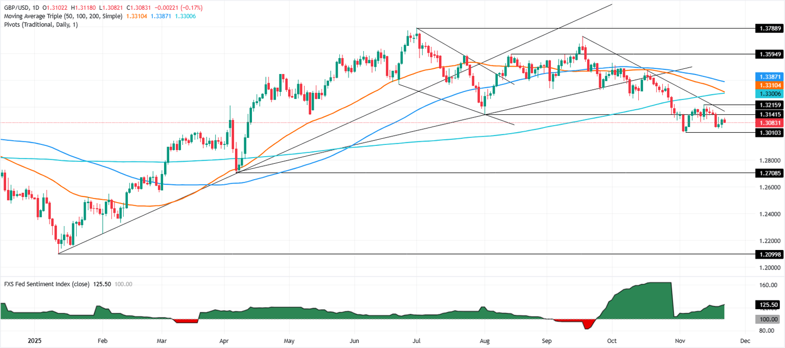 La Libra se mantiene contenida con el DXY estable por encima de 100, los mercados se preparan para una agenda de datos pesados de EE.UU. y un endurecimiento fiscal en el Reino Unido.