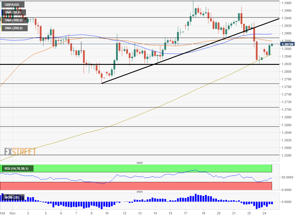 La libra ha roto por debajo de la línea de soporte de tendencia alcista que lo ha estado acompañando desde principios de noviembre, una señal bajista. También sufre un impulso a la baja en el gráfico de cuatro horas. Sin embargo, la libra logró aferrarse al colchón de mediados de noviembre de 1.2820 y elevarse por encima del promedio móvil simple de 200.
