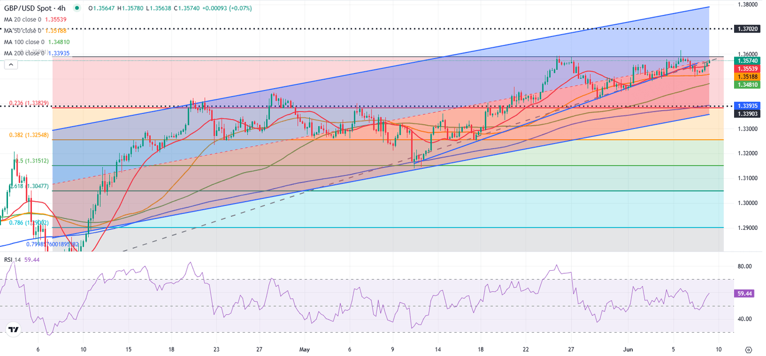 El GBP/USD cerró la última vela de 4 horas por encima de la media móvil simple (SMA) de 20 períodos en el gráfico de 4 horas y el indicador RSI se elevó hacia 60, reflejando una acumulación de impulso alcista.