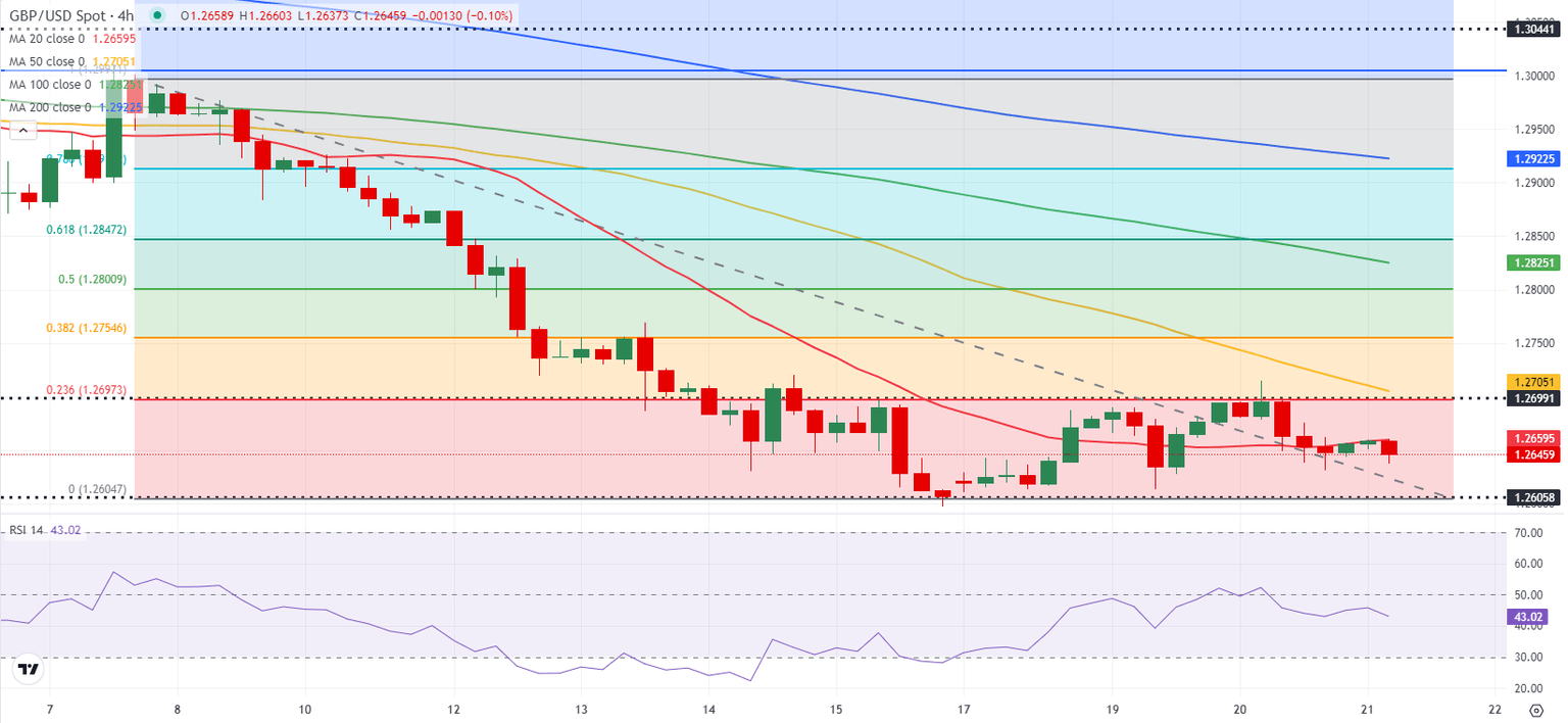 El indicador de Índice de Fuerza Relativa (RSI) en el gráfico de 4 horas sigue bajando hacia 40 y el GBP/USD cotiza por debajo de la media móvil simple (SMA) de 20 periodos, reflejando el sesgo bajista.