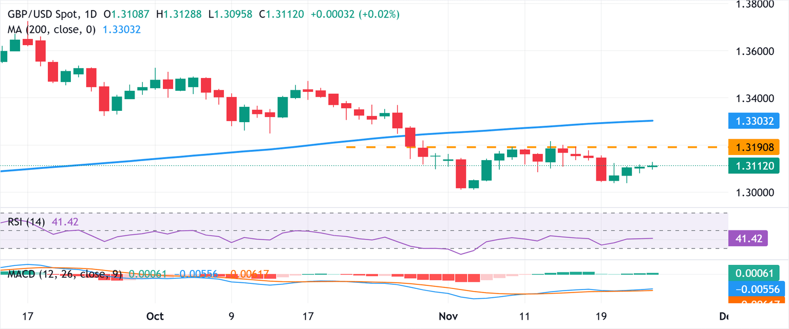 El par GBP/USD atrae compradores por cuarto día consecutivo y se mantiene estable por encima de la cifra redonda de 1.3100 durante la primera mitad de la sesión europea del martes. Los operadores optan por aligerar sus apuestas bajistas en torno a la Libra esterlina (GBP) antes del presupuesto de otoño del Reino Unido el miércoles. El Dólar estadounidense (USD), por otro lado, extiende su movimiento de precio consolidativo en medio de señales mixtas de los funcionarios de la Reserva Federal (Fed) y resulta ser otro factor que actúa como viento de cola para los precios al contado. Sin embargo, la incertidumbre en torno a la declaración fiscal de la canciller del Reino Unido, Rachel Reeves, podría limitar un movimiento de apreciación adicional para el par de divisas.