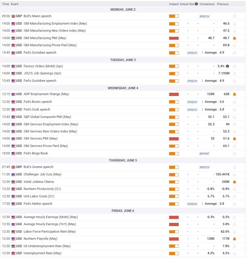 El lunes, el Instituto de Gestión de Suministros de EE.UU. (ISM) publicará su PMI Manufacturero, que será seguido por discursos de los responsables de la Fed, incluida la aparición del presidente Jerome Powell en la Reserva Federal Conferencia del 75º Aniversario de la División de Finanzas Internacionales de la Junta de Gobernadores, en Washington DC.