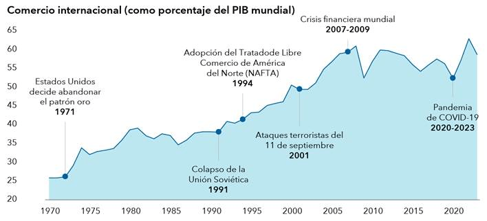 Fuente: Capital Group, OCDE, Banco Mundial. El comercio internacional se calcula como la suma de exportaciones e importaciones de bienes y servicios, y se representa como un porcentaje del producto interior bruto mundial (PIB). Los últimos datos disponibles son hasta 2023, a fecha de 17 abril 2025.