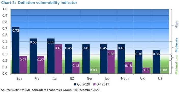 A efectos de comparación, el riesgo de deflación de Japón se ha mantenido en niveles moderados, mientras que el riesgo para Reino Unido y Estados Unidos también ha aumentado de mínimo a moderado.