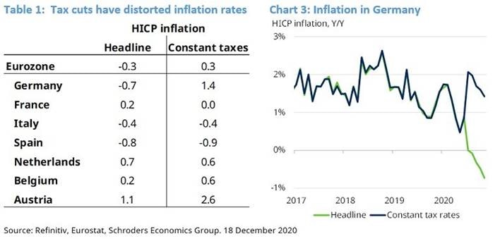 Alemania es una de las principales causas de la resistencia de la eurozona, ya que la tasa de inflación de Alemania sería de +1,4% en lugar de la tasa real actual de -0,7%. Austria también ha visto una gran distorsión. A diferencia de Alemania, que redujo el IVA en todos los bienes y servicios, Austria hizo un recorte mayor, pero sólo para restaurantes, cines y otros sectores de servicios muy afectados.