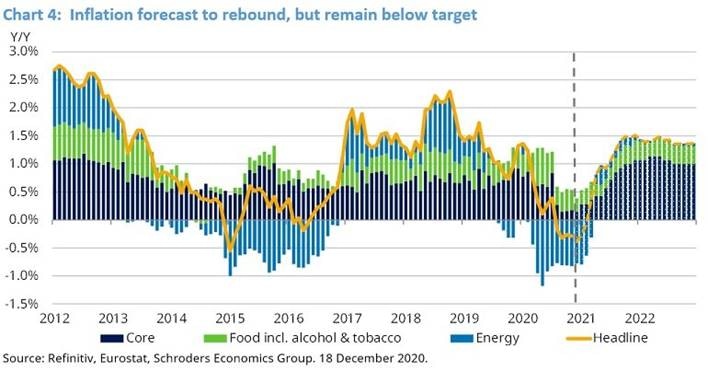 A corto plazo, confiamos en que la inflación repuntará hasta el punto de que los temores a la deflación disminuyan. Sin embargo, dada la advertencia del índice de vulnerabilidad a la deflación, es probable que persista la cautela. De hecho, el pronóstico de inflación del BCE tiene una recuperación en 2021, pero no hasta su objetivo de inflación "cercana pero inferior al 2%". Esto sugiere que podría haber más estímulo monetario a finales de 2021, pero como mínimo, los inversores no deberían esperar ningún aumento significativo de los tipos de interés durante al menos dos o tres años.