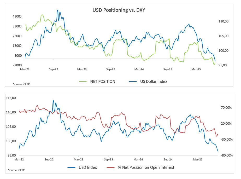 Las posiciones cortas netas no comerciales en el Dólar estadounidense (USD) han caído a mínimos de dos semanas, alcanzando aproximadamente 4.3K contratos. Esta disminución ocurre junto con un quinto aumento consecutivo en el interés abierto, que ahora ha alcanzado niveles no observados desde mediados de marzo, alrededor de 36.3K contratos. El Índice del Dólar estadounidense (DXY) continuó su trayectoria a la baja, cayendo a mínimos de varios años cerca de 96.40.
