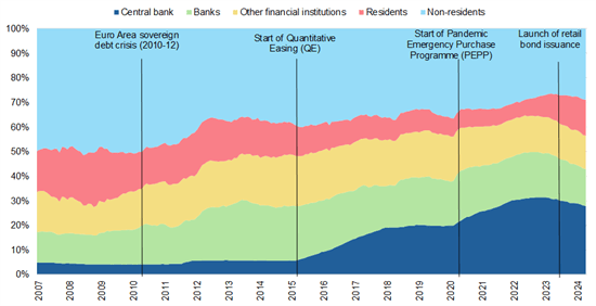 Gráfico 1: Deuda pública italiana por sector de tenencia, 2007-2024 %