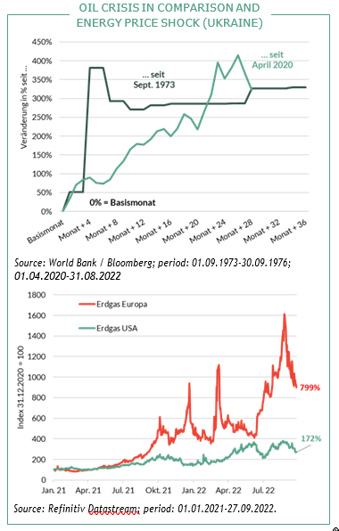 En ambos casos, el aumento de los precios de la energía incrementó la inflación en EE.UU. y obligó a la Reserva Federal a subir sustancialmente los tipos de interés. El resultado: estanflación, es decir alta inflación sin crecimiento. La inflación fue del 9,2% de media durante la primera crisis del petróleo, y del 8,4% durante el conflicto de Ucrania hasta ahora. El crecimiento del PIB cayó del 5,7% en 1973 al -0,5% en 1974. Para 2022, el crecimiento se estima en un 1,5%, por debajo del 6% del año anterior. En la década de los 70, la cotización de las acciones no reaccionó bien ante una situación tan mixta. El S&P 500 americano (rendimiento total) sólo volvió a su nivel anterior a la crisis después de unos 3 años. La pérdida máxima en ese momento fue de casi el 50%. Desde la invasión rusa de Ucrania, el S&P 500 ha caído casi una cuarta parte hasta ahora.