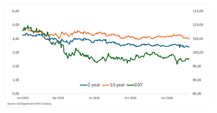También está el canal de tasas. Si la inversión en IA mantiene el gasto de capital elevado y gradualmente empuja la tasa neutral más alta, los rendimientos de EE.UU., particularmente en el extremo largo, pueden mantenerse más firmes de lo que el consenso asume. Una tasa de equilibrio estructuralmente más alta haría más difícil sostener una narrativa amplia bajista del USD.