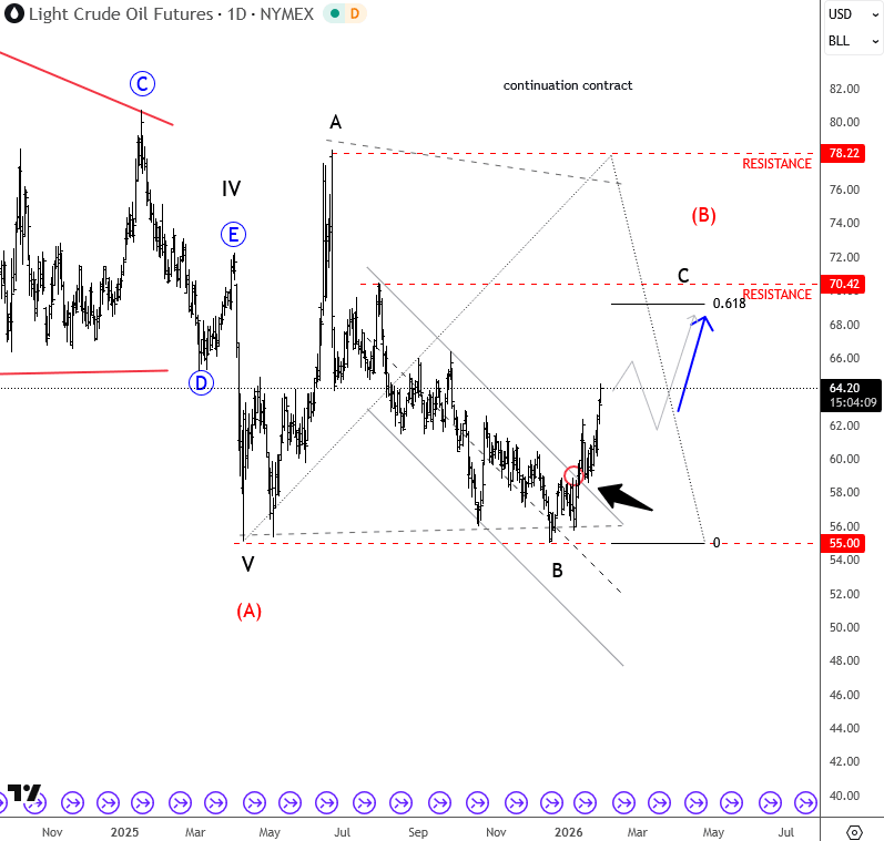 El petróleo crudo ha visto una recuperación muy buena en las últimas semanas, pero ahora parece que los alcistas están haciendo una pausa después de que el precio no lograra superar la resistencia horizontal de 64,0. La caída actual es bastante agresiva y parece ser parte de una corrección A-B-C más profunda, lo que sugiere que el anterior aumento de cinco ondas puede haberse desarrollado como una diagonal líder. El soporte en las caídas podría encontrarse en el área de 58,40 a 60, donde el mercado podría estabilizarse nuevamente después de este retroceso correctivo. A pesar de la fuerte reversión a la baja, aún asumimos que los alcistas no han terminado, especialmente considerando la ruptura agresiva del canal descendente mostrado en el gráfico diario.