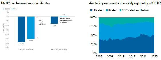 Los bonos estadounidenses de alto rendimiento han resistido las recientes ventas, generando una rentabilidad ligeramente positiva, a pesar de que la renta variable estadounidense ha caído alrededor de un 8% en lo que va de año (a 23 de abril de 2025). Por el contrario, durante la crisis financiera mundial, los rendimientos de ambas clases de activos estuvieron muy correlacionados, y la caída del alto rendimiento estadounidense alcanzó el 88% de la caída de la renta variable estadounidense.