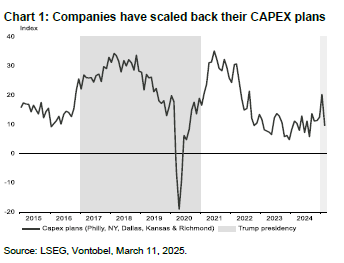 Esto significa que Trump debe cumplir al menos algunas de sus amenazas, de lo contrario pierde credibilidad. Como tal, la retórica de Trump no nos sorprende. Sin embargo, lo que sí nos sorprendió fue la agresividad de Trump, especialmente en lo que respecta a Canadá y México. Seguimos creyendo que los aranceles no durarán para siempre: no pueden traer «de vuelta a casa» los empleos manufactureros estadounidenses «perdidos» (es demasiado tarde para eso) y no pueden financiar el gasto público actual (es demasiado grande para financiarlo con aranceles). En nuestra opinión, los aranceles se utilizan principalmente como herramienta de negociación para cuestiones internas (por ejemplo, inmigración, crisis del fentanilo) o externas (por ejemplo, aumentar el gasto militar de los miembros de la OTAN). Hay que admitir que cuanto más tiempo se mantengan los aranceles y la incertidumbre comercial, más daño se hará a la economía.