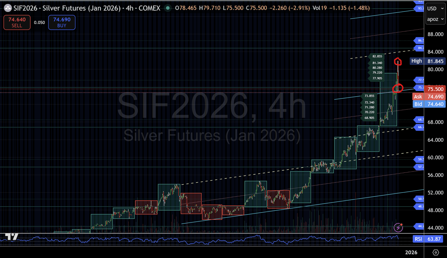 La plata se ha movido rápidamente de una base prolongada a un descubrimiento de precios vertical. La velocidad del avance, más que su tamaño solo, ha atraído una participación más amplia. Históricamente, esta es la fase donde los mercados transitan de una expansión direccional a un período de evaluación, ya que comienza a aparecer el comercio bidireccional y la respuesta del precio se vuelve más importante que el momentum.