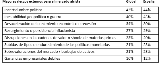 El último informe RIB revela que los inversores globales consideran la incertidumbre política (43%), la inestabilidad geopolítica o la guerra (40%) y la desaceleración o recesión económica (34%) como los principales riesgos externos para el mercado alcista en 2026. En parecidos términos se manifiestan los minoristas españoles. Con una pequeña salvedad: perciben las posibles subidas de tipos de interés y una hipotética fase de sobrevaloración del mercado o de aparición de burbujas especulativas sobre determinados activos como amenazas más factibles en 2026 que las disrupciones de las cadenas de valor (ver cuadro adjunto). También son más pesimistas que los inversores internacionales respecto a las ganancias corporativas el próximo ejercicio.