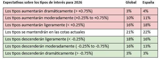 La mayoría de los inversores anticipa cambios en los tipos de interés para 2026: el 37% espera una disminución y el 29%, un aumento. Entre quienes prevén una disminución, el 18% prevé una ligera reducción de hasta el 0.25%, mientras que el 16% espera una disminución moderada de entre el 0.25% y el 0.75%.