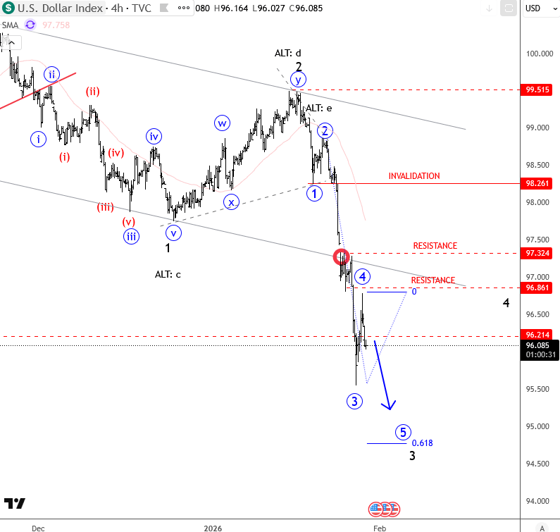 El Dólar ha experimentado una fuerte y prolongada caída, exactamente como discutimos y esperamos en nuestras actualizaciones anteriores. La debilidad del Dólar ha empujado ahora a nuevos mínimos, rompiendo por debajo de los niveles de 2025, lo que sugiere que pronto podríamos estar entrando en condiciones más sobreextendidas. Esto significa que en algún momento podríamos ver retrocesos significativos. Al mismo tiempo, todavía hay mucho sucediendo en el trasfondo, incluyendo incertidumbre y una posible escalada entre EE.UU. e Irán, el riesgo de un cierre parcial del gobierno de EE.UU., y el evento más reciente fue la decisión de la Fed ayer. La Fed decidió mantener las tasas estables en la primera reunión de 2026, ya que la economía está funcionando bastante bien, pero también hay una fuerte presión por parte del presidente Trump hacia Powell, lo que podría ayudar a estabilizar el dólar a corto plazo.