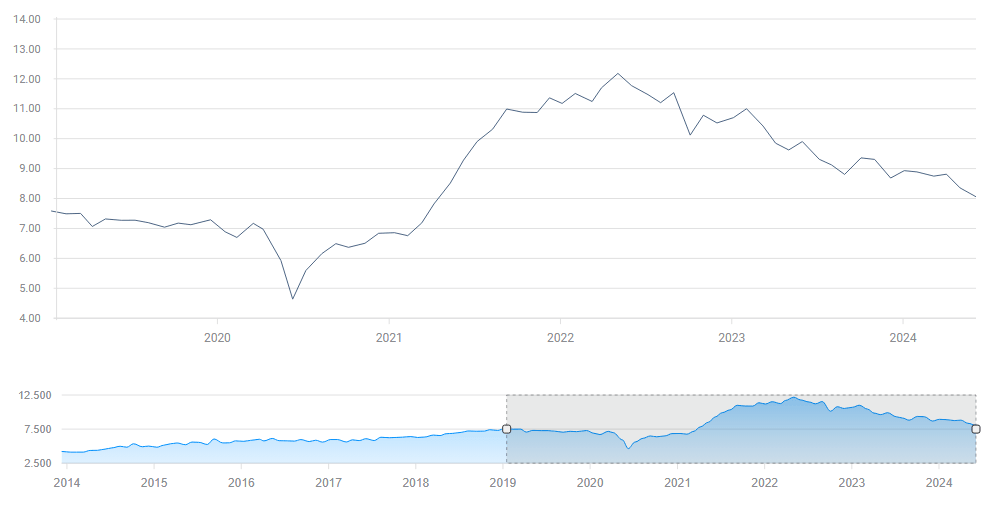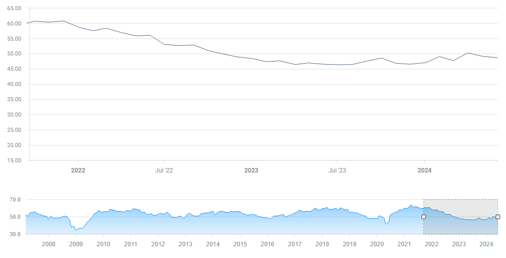 El componente de Precios Pagados también es de interés, ya que refleja las expectativas de inflación en el sector industrial. Se proyecta una pequeña disminución a 55,9 desde 57, un hecho que aumentaría las esperanzas de una pronta reducción de tasas por parte de la Reserva Federal (Fed).