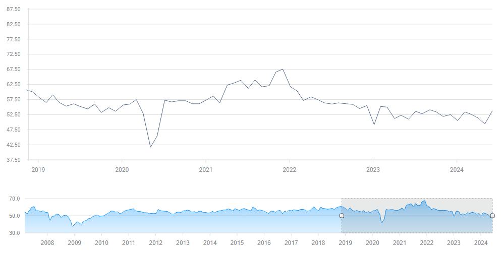 Al igual que con otras publicaciones, el punto óptimo para los mercados está en el medio: un crecimiento moderado continuo que permitiría recortes de tasas y evitaría una recesión. Una caída por debajo de 50 desencadenaría preocupaciones de una desaceleración, mientras que una aceleración renovada alejaría los recortes de tasas por más tiempo.