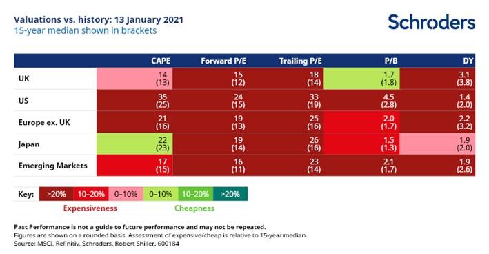 Nuestra expectativa de que las vacunas proporcionarían una inyección para las acciones de recuperación ha demostrado ser así. Los mercados han subido bastante desde entonces y, como señalamos el mes pasado, las valoraciones de los principales mercados parecen caras en comparación con las bases históricas.