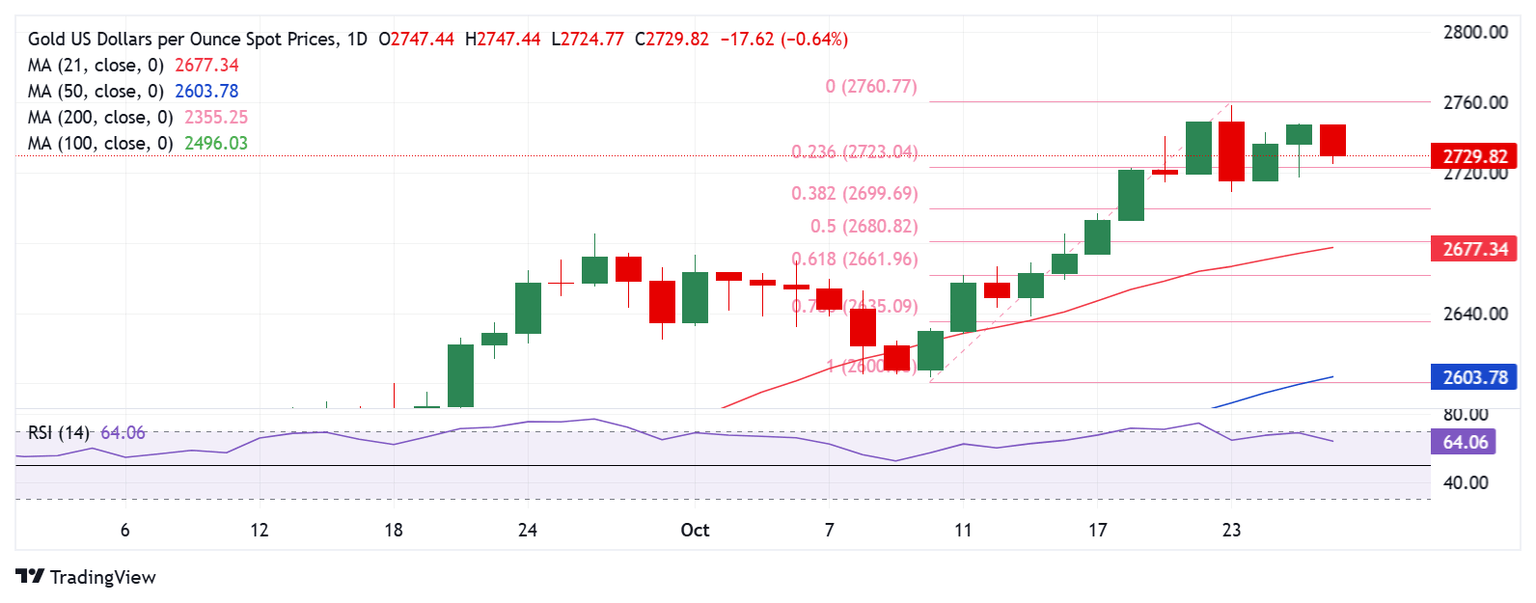 El precio del Oro ha probado 2.723$, el nivel de retroceso de Fibonacci del 23.6% del último rally récord desde el mínimo del 10 de octubre de 2.604$ hasta el máximo histórico de 2.759$, en su renovada caída.