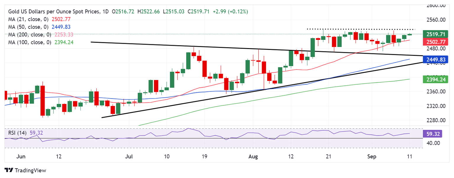 El precio del Oro está consolidando una tendencia alcista de dos días por encima de 2.500$ en la negociación asiática del miércoles. Los compradores de Oro se toman una pausa, con el próximo movimiento direccional probablemente desencadenado por los datos críticos del Índice de Precios al Consumidor (IPC) de EE.UU. que se publicarán más tarde este miércoles.