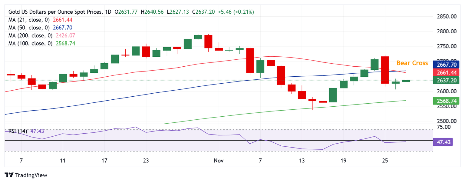 Por lo tanto, cualquier intento al alza en el precio del oro podría ser vendido a menos que los compradores encuentren aceptación por encima del cruce de la SMA de 21 días y la SMA de 50 días cerca de 2.660$.