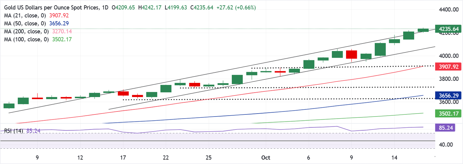 Como los compradores parecen imparables por ahora, el nivel psicológico de 4.250$ será el siguiente en la mira, por encima del cual se abrirán las puertas hacia los 4.300$.