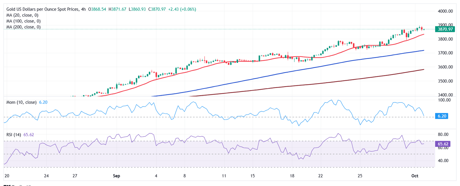El Oro alcanzó un máximo de 3.895,29$ el miércoles, un nuevo máximo histórico. El metal brillante se recuperó tras la noticia de que el gobierno de Estados Unidos (EE.UU.) se cerró efectivamente el miércoles, ya que el Congreso no pudo llegar a un acuerdo sobre un proyecto de ley de financiación. El Dólar estadounidense (USD) cayó frente a todos los principales rivales, beneficiándose más los activos de refugio seguro.