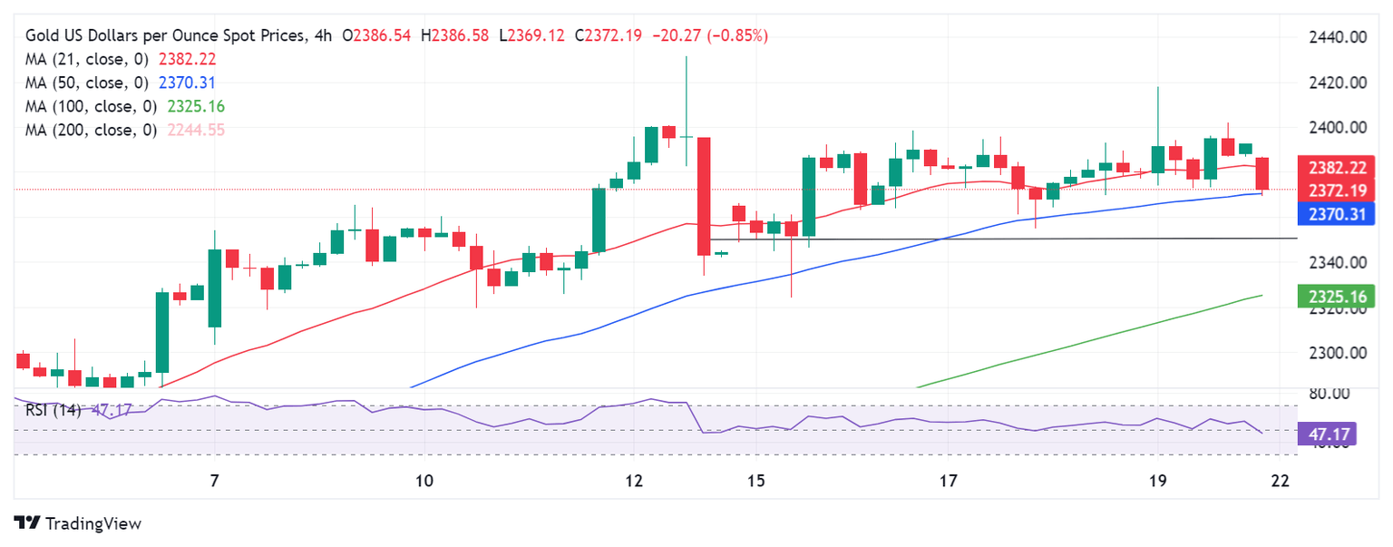 Como se observa en el gráfico de cuatro horas, el precio del Oro ha perforado la media móvil simple (SMA) de 21 en 2.382 dólares para desafiar el siguiente soporte clave en 2.370 dólares, la SMA de 50 días.