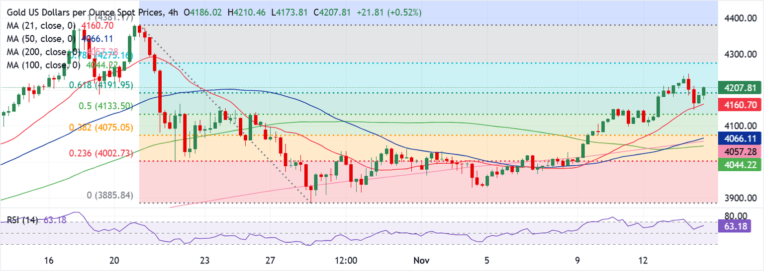 - El Oro revisita el nivel de 4.200$ temprano el viernes tras un fuerte retroceso, apunta a ganancias semanales.