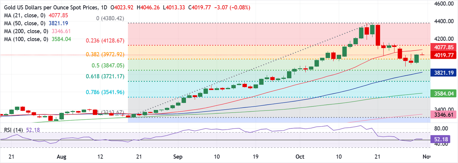 El gráfico diario muestra que el precio del Oro recuperó la barrera de 4.000$ en base de cierre el jueves, reavivando el potencial alcista.
