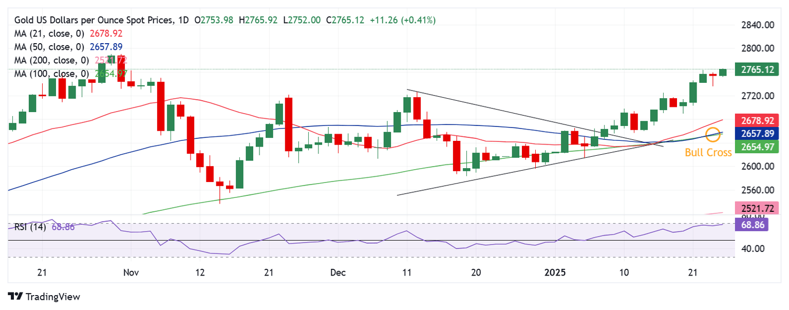 El precio del Oro debe buscar un cierre diario por encima del máximo de noviembre de 2024 de 2.762$ para alcanzar el próximo objetivo cerca de la mencionada resistencia cerca de 2.790$.