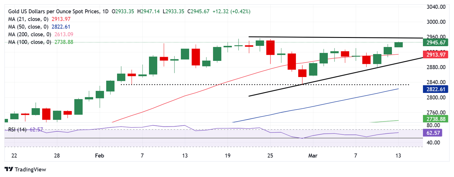 El precio del Oro está formando máximos más altos mientras traza una formación de triángulo ascendente, que podría confirmarse con un cierre de vela diaria por encima del máximo histórico de 2.956$.