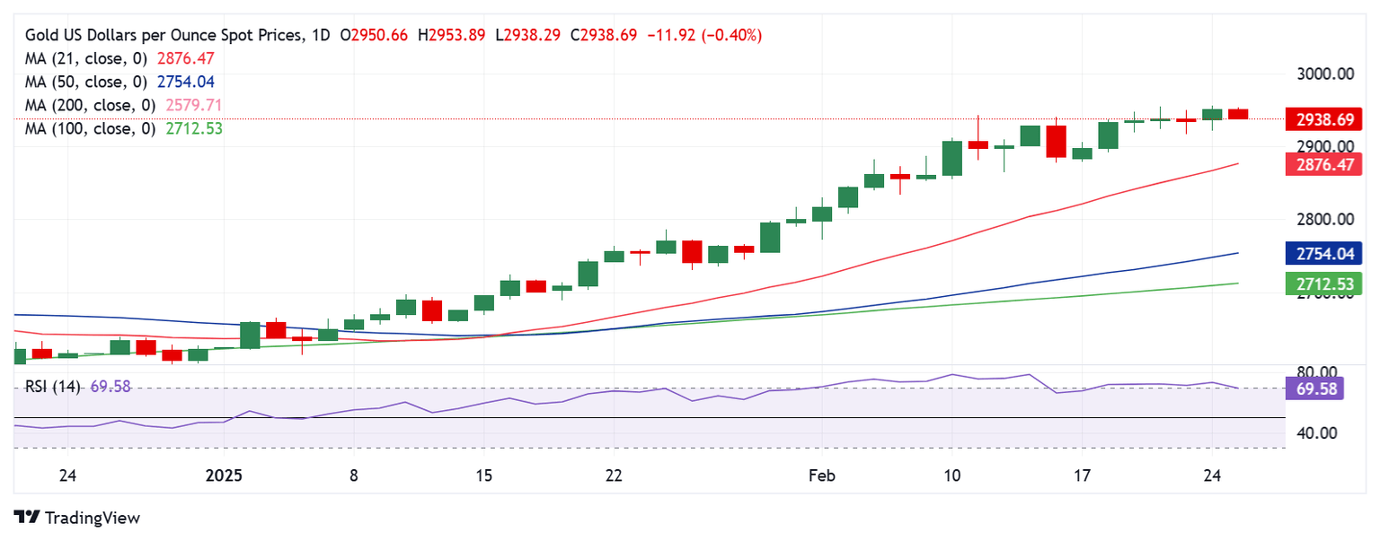 El gráfico diario muestra que el precio del Oro está retrocediendo desde máximos históricos de 2.956$, habiendo encontrado aceptación por encima de la clave barrera psicológica de 2.950$ en una base de cierre el lunes.