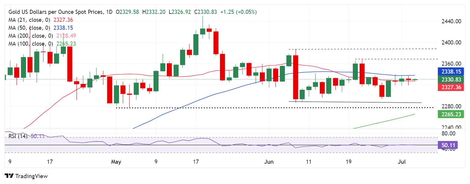 Con el Índice de Fuerza Relativa (RSI) de 14 días coqueteando con el nivel 50 y el precio del Oro defendiendo la Media Móvil Simple (SMA) de 21 días en 2.328$, los riesgos parecen estar divididos equitativamente para los operadores.