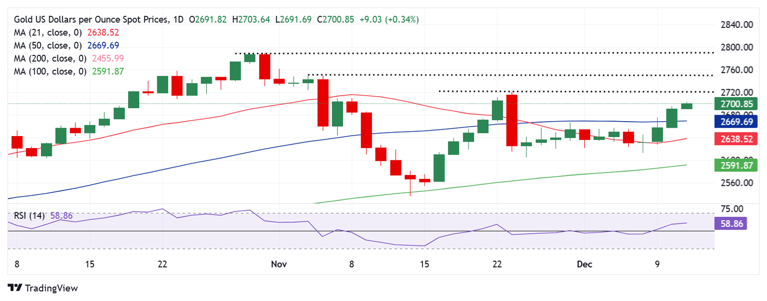El gráfico diario muestra que el precio del Oro rompió la fase de consolidación al alza después de recuperar la clave de la Media Móvil Simple (SMA) de 50 días en 2.670$ en el cierre diario del martes.
