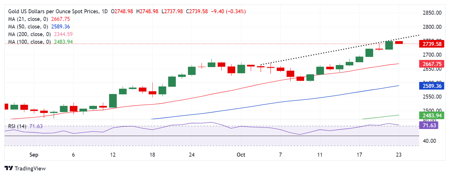 El precio del Oro está viendo una leve corrección el miércoles, después de haber alcanzado un nuevo máximo histórico de 2.749$ a finales de la sesión de EE.UU. La fortaleza sostenida del Dólar estadounidense (USD) y los rendimientos de los bonos del Tesoro de EE.UU. pesan sobre el precio del Oro.