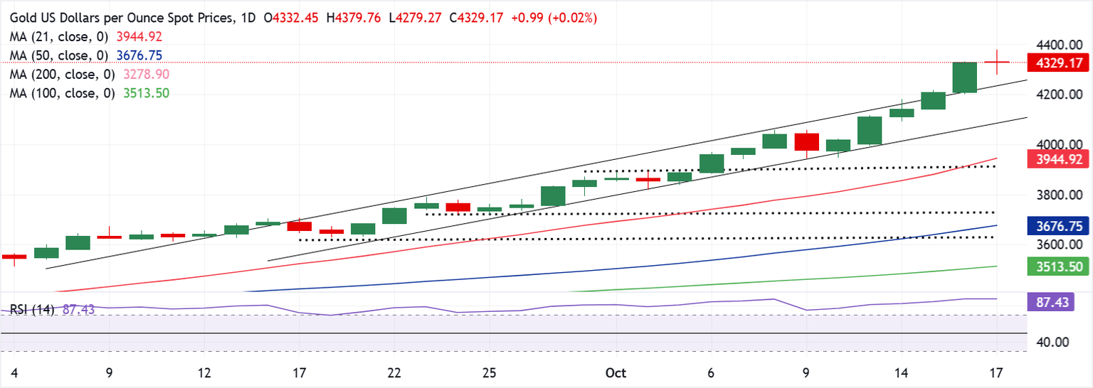 El Oro experimenta una intensa volatilidad en las horas de negociación asiáticas del viernes, impulsado por una ronda de toma de beneficios y flujos de aversión al riesgo, tras el último aumento parabólico a nuevos máximos récord cerca de 4.380$.