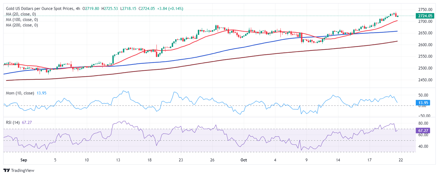 Desde un punto de vista técnico, el gráfico diario de XAU/USD muestra que el riesgo sigue sesgado al alza. El par se desarrolla por encima de medias móviles alcistas, con la media móvil simple (SMA) de 20 días actualmente en torno a 2.660$. El indicador Momentum perdió su fuerza alcista pero se mantiene cerca de su máximo de octubre, mientras que el indicador del Índice de Fuerza Relativa (RSI) se volvió sin dirección en torno a 72, lo que sugiere un interés de compra decreciente.