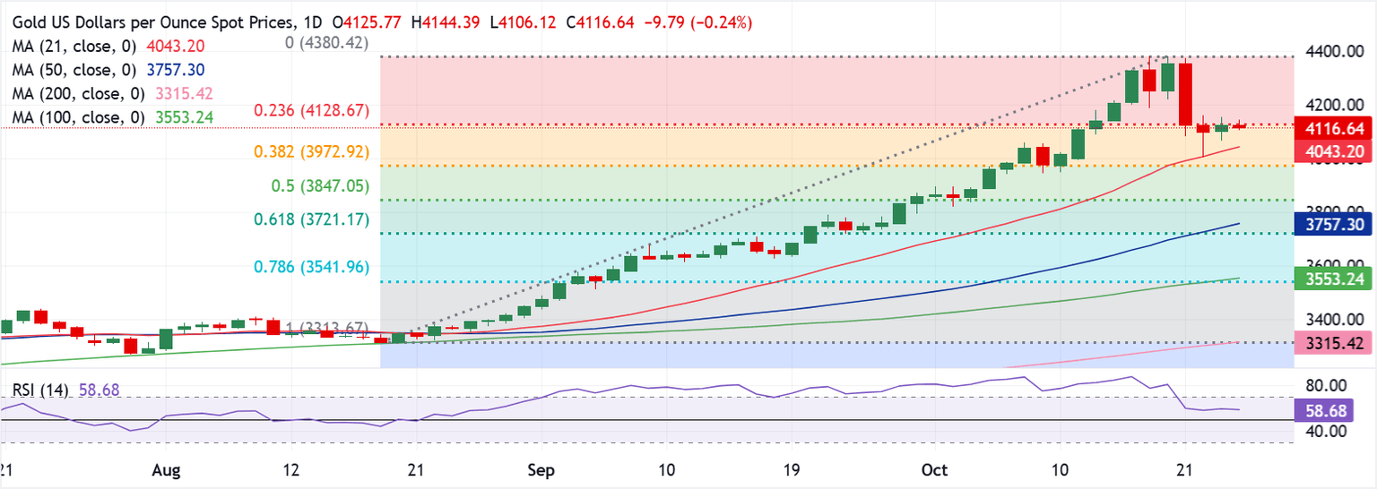 El Oro se encuentra en una encrucijada crítica en el gráfico diario, después de haber fallado en cerrar por encima del soporte convertido en resistencia del 23.6% de retroceso de Fibonacci (mínimo del 19 de agosto al máximo del 20 de octubre) en 4.129$ el jueves.