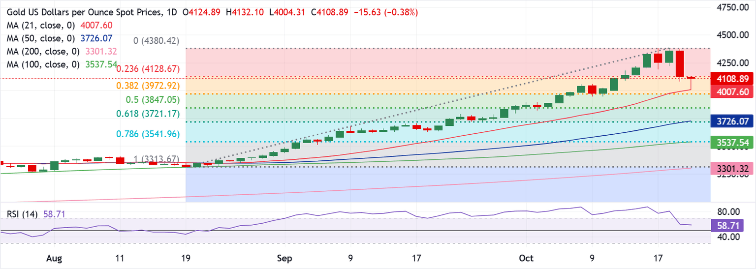 El Oro probó el soporte crítico en el área de 4.007$-3.973$, donde la media móvil simple (SMA) de 21 días y el nivel de retroceso de Fibonacci del 38.2% de la subida parabólica desde mediados de agosto se alinean.