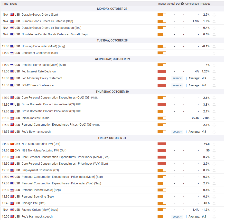 El Foro de Cooperación Económica Asia-Pacífico (APEC) se llevará a cabo en Corea del Sur del 30 de octubre al 1 de noviembre. Se espera que el presidente chino, Xi Jinping, y el presidente de EE.UU., Trump, se reúnan para discutir las relaciones comerciales. Si las partes pueden evitar una escalada del conflicto llegando a un acuerdo sobre los controles de exportación propuestos por China sobre tierras raras y las amenazas arancelarias aumentadas de EE.UU., el Oro podría perder interés como refugio seguro y continuar debilitándose. Por el contrario, el Oro podría comenzar a subir si se cancela la reunión Xi-Trump o si las partes no logran encontrar un punto medio para extender la tregua comercial.
