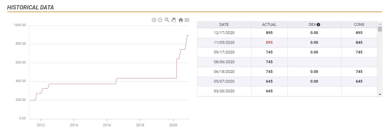 El Banco de Inglaterra (BoE) redujo su tasa clave en 65 puntos básicos hasta el 0.1% en dos reuniones de emergencia que tuvieron lugar en marzo. Además, el Banco de Inglaterra amplió su Línea de Compra de Activos en tres ocasiones distintas y elevó la cantidad total desde los 435.000 millones de libras en febrero hasta los 895.000 millones de libras en noviembre.