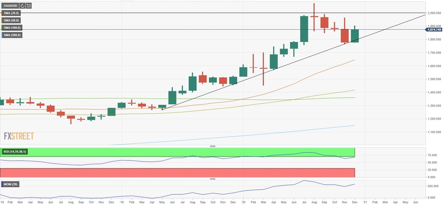 En el gráfico mensual, el precio parece haberse recuperado por encima de la línea de tendencia ascendente desde mayo de 2019, lo que confirma la perspectiva alcista. Si el XAU/USD continúa siguiendo esa línea, se podría esperar un aumento por encima de los 2.000$ a mediados de 2021.